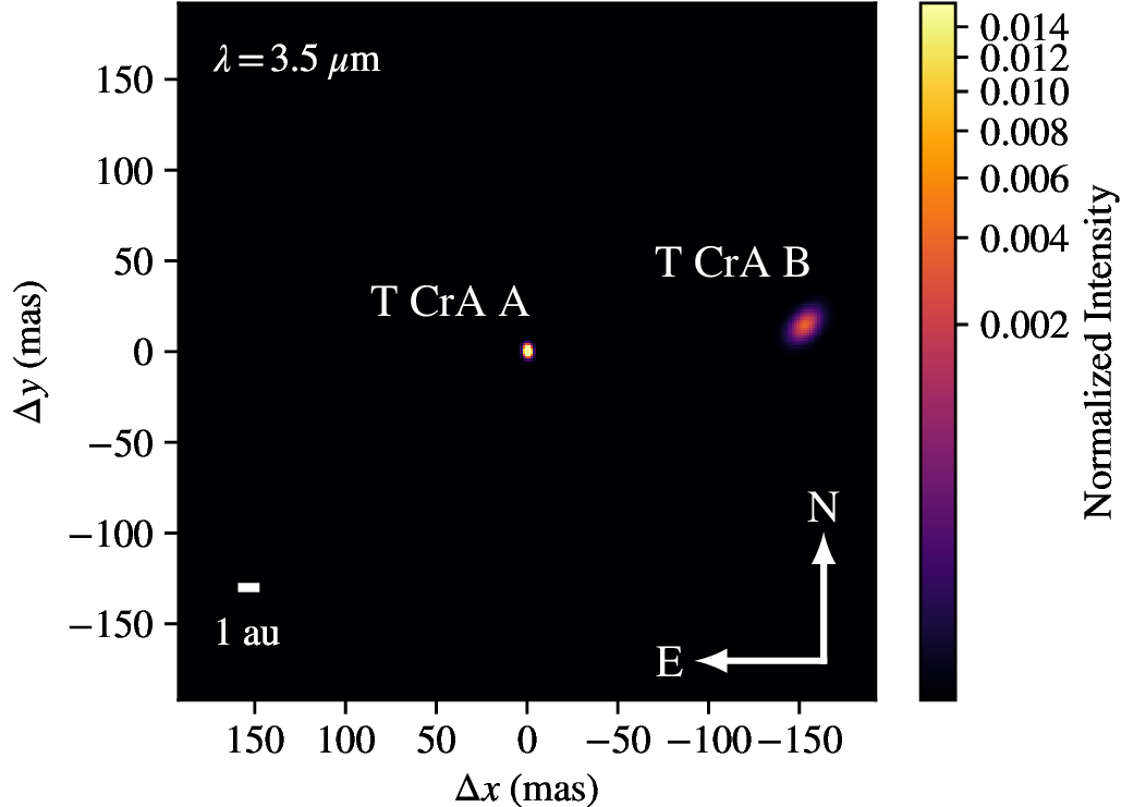 We modeled the data with a geometric model using the Python tool oimodeler. We detected a companion (T CrA B) with a projected separation of ∆r = 153.2 ± 1.2 mas (≍23 au) toward the west direction at a position angle of 275.4 ± 0.1°, in 2024 May─August. Our results support that the companion has a nearly edge-on orbit that is highly misaligned with respect to the circumprimary disk. Such a configuration could cause warping and tearing of the disk around the primary, which has been proposed by recent studies. In the L band the companion is extended, with a full width at half maximum (FWHM) size of ∼1 au, suggesting that the emission comes from a disk around the secondary star. The companion flux is 0.2─0.3 Jy in the L band, and 0.2─0.7 Jy in the N band, accounting for 4─20% of the total emission at those wavelengths. The SED of the companion is compatible with thermal radiation of warm dust (600─800 K).